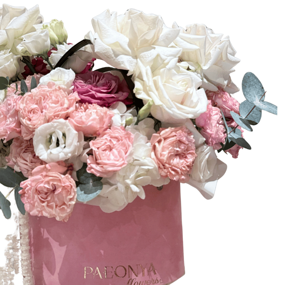 An exquisite floral statement designed for moments that deserve nothing less than perfection. The Blush Royale Hat Box showcases premium white roses and soft blush spray roses, artfully layered with refined seasonal blooms and silvery eucalyptus accents. Presented in an elegant pink velvet hat box, this arrangement embodies sophistication, grace, and timeless luxury. Ideal for anniversaries, exclusive celebrations, and unforgettable gestures of refined taste.